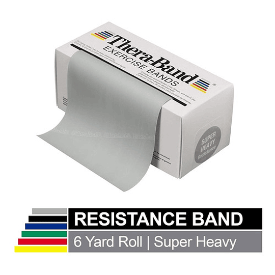 | Resistencia Super, Color: Gris | Presentacion: 45,7 mt / 5,5 mts / 1,5 mts x 30 Espesor: 0,56 mm Ancho: 14 cm Enlogacion: 100% 4,6 kg (equivale al estirar la banda la 100%, representa una fuerza en Kg) Material: Latex Descripcion: Codigo de color progresivo de resistencia, son ideales para la practica de deporte, faciles de transportar y utilizar. |